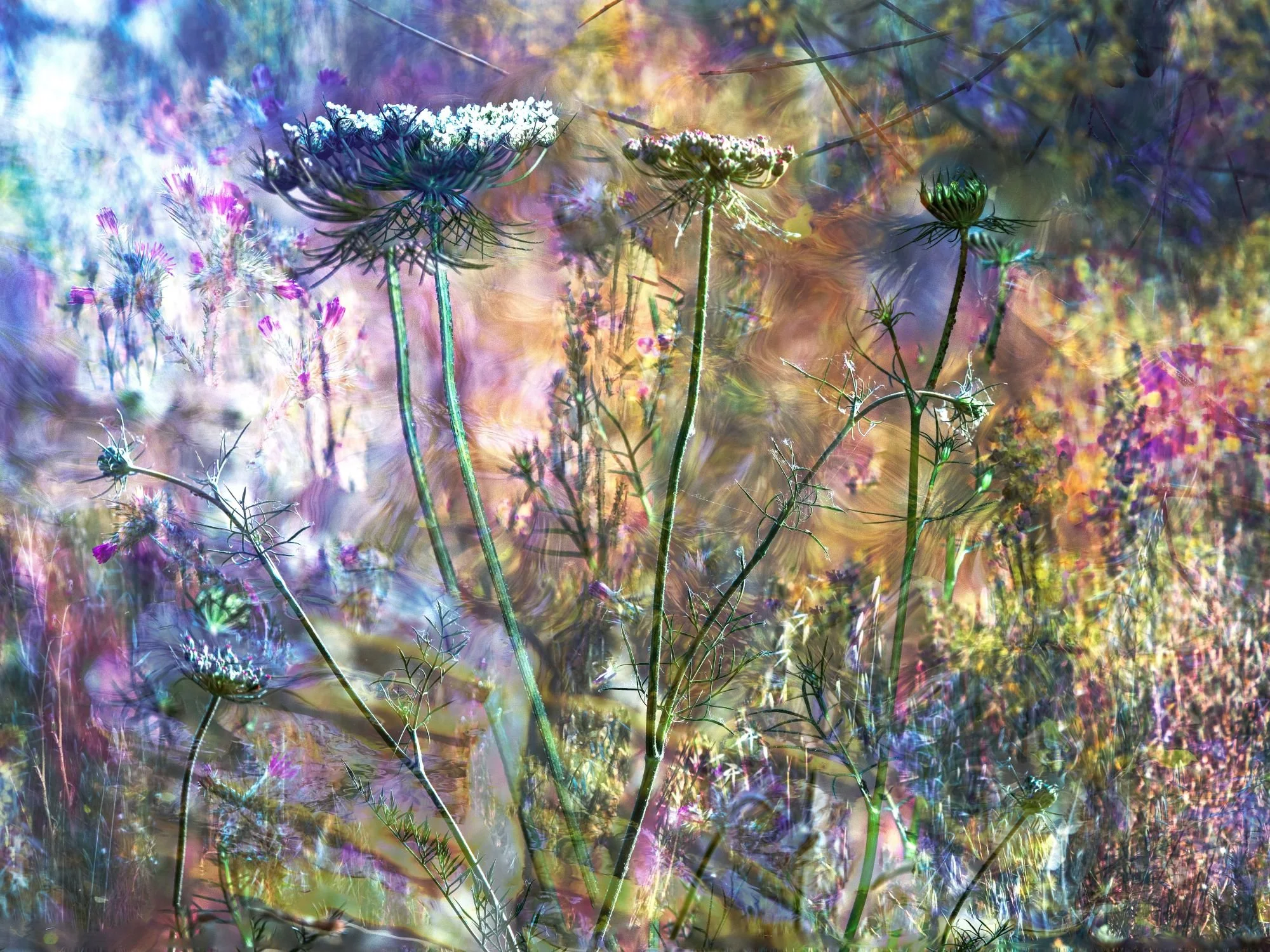 Las imágenes emergen de una fusión visual, donde luz, color y estructura se entrelazan para crear escenas que invitan a la introspección. Ramas, sombras y destellos se combinan en visiones etéreas entre lo real y lo imaginado. “El jardín de los secretos” es una invitación a habitar el misterio, a descubrir lo invisible en lo cotidiano, a incorporar en la decoración piezas que transmiten profundidad y delicadeza.
