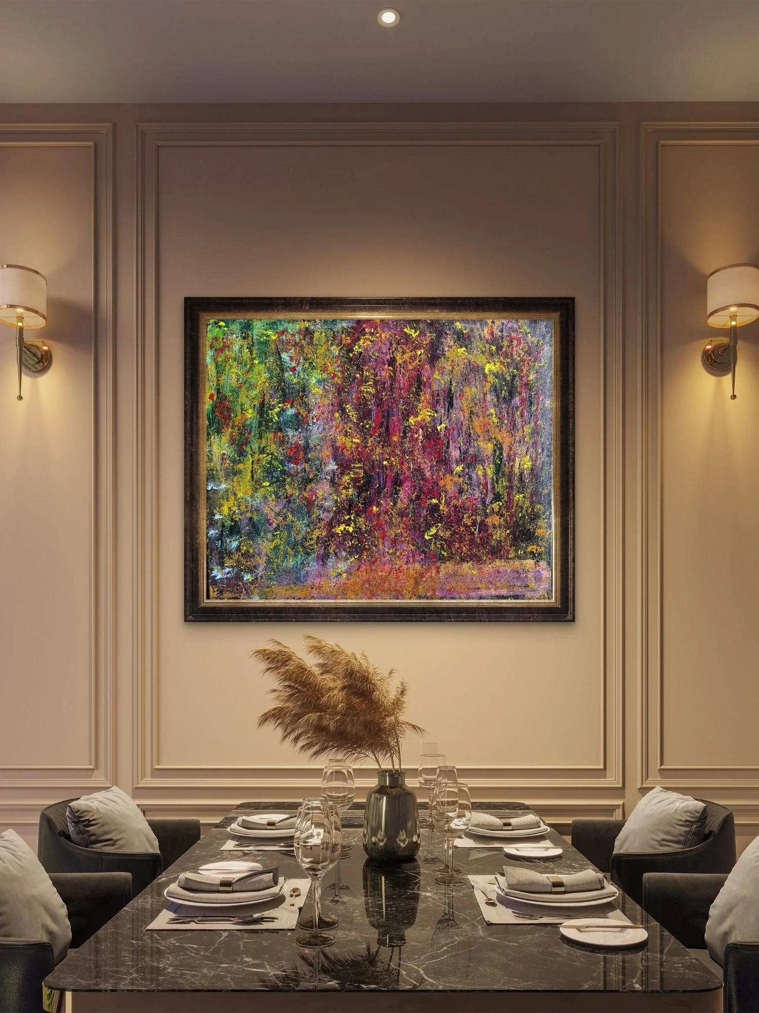 “Kōyō” (Hojas de otoño) es una explosión abstracta de color. La obra representa la belleza intensa y fugaz del follaje de transición.